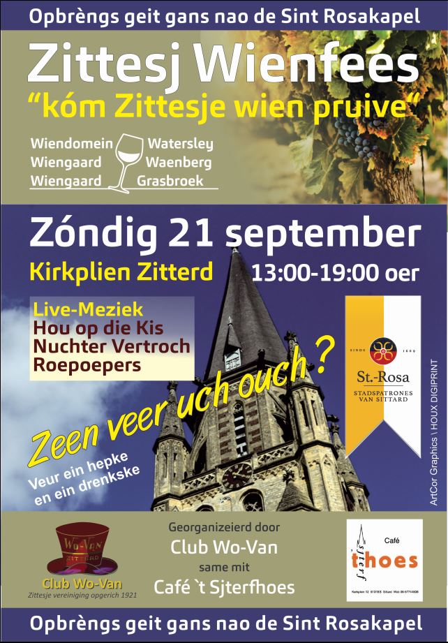 De druivenoogst start op zaterdag 20 september om 9 uur!!! kom op tijd naar de wijngaard met gewassen snoeischaar. Zondag is het Zittesj Wienfees. Laat u verrassen….